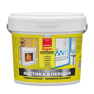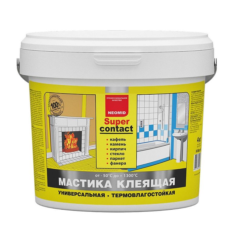 Мастика клеящая универсальная термовлагостойкая (высохший клеевой шов выдерживает температуру от -50° С до +1300° С) «NEOMID» предназначена для кладки и облицовки печей и каминов, склеивания кафельной и метлахской плитки, стекла, пенополистирольных потолочных плиток, дерева, картона, бетона, кирпича, натурального и искусственного камня (кроме материалов на гипсовой основе) в любых сочетаниях, неглубокой шпатлевки оштукатуренных и бетонных поверхностей, наклеивания фанеры на стяжку (кроме поверхностей, имеющих постоянный контакт с водой).