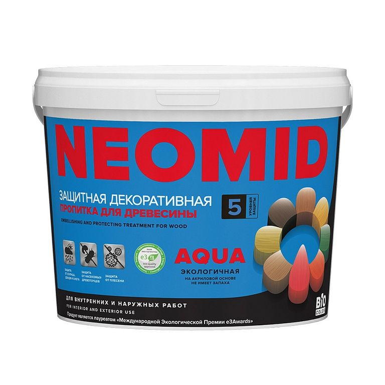 NEOMID Bio Color Aqua — деревозащитный декоративный состав на акриловой основе для высокоэффективной защиты и декоративной отделки деревянных поверхностей. Образует на поверхности древесины «дышащую» шелковисто-матовую защитную пленку с высокими декоративными и защитными свойствами. Состав экологически безопасен, не содержит растворителей. Образующееся покрытие обладает оптимальной паропроницаемостью и одновременно герметично к капельной влаге. Благодаря входящим в состав активным добавкам покрытие имеет пятиступенчатую систему защиты деревянной поверхности: