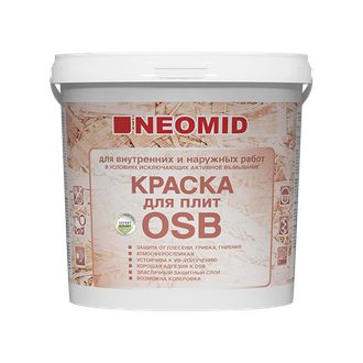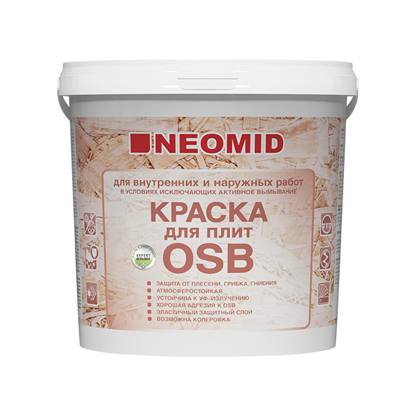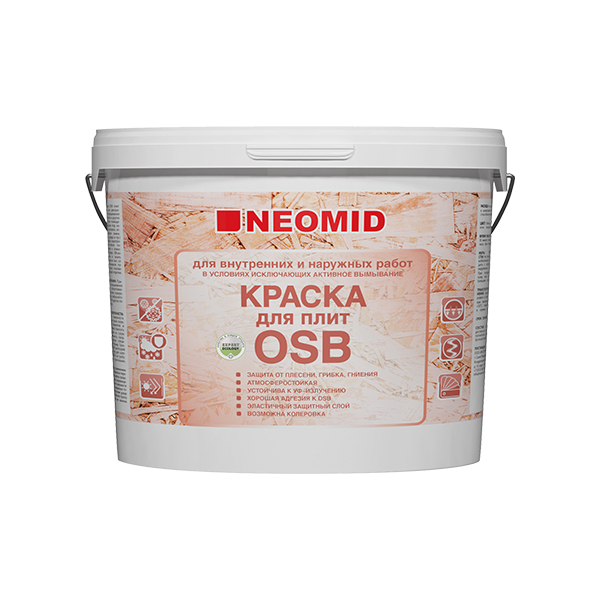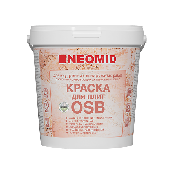 ПОДГОТОВКА ПОВЕРХНОСТИ: Обрабатываемая поверхность должна быть очищена от грязи, пыли, отслаивающихся элементов и жировых загрязнений. Наносить Краску необходимо на сухую и прочную поверхность, предварительно покрытую специальным грунтом Неомид Грунтовка для плит OSB (для категорий OSB-3, OSB-4). Плиты категорий OSB-1 и OSB-2 не требуют обязательного грунтования.