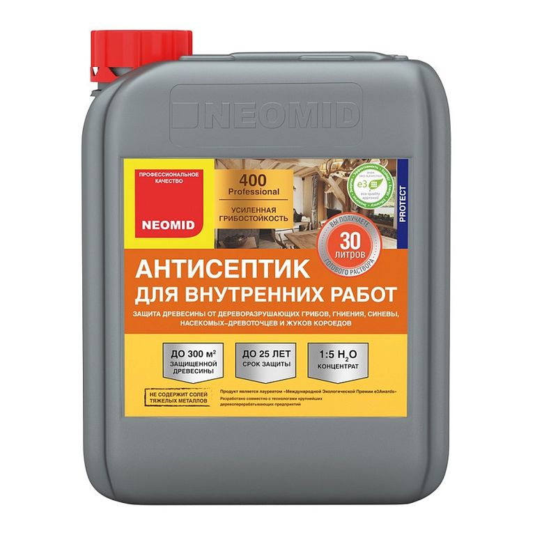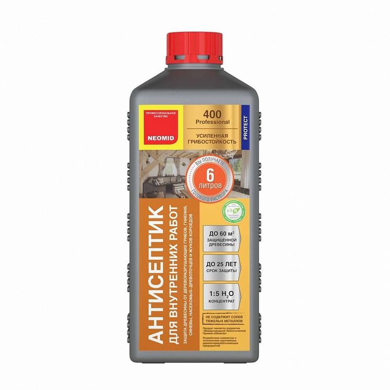 NEOMID 400 ECO — новое высокоэффективное деревозащитное средство на водной основе для внутренних работ. Предназначено для усиленной защиты древесины на срок до 25 лет от гниения, поражения дереворазрушающими и деревоокрашивающими плесневыми грибам.